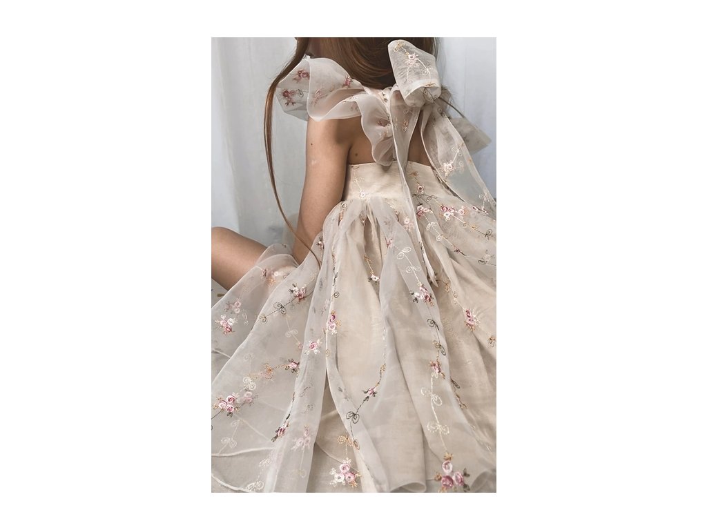 Šaty majú široké ramienka s volánikmi, ktoré sa zaväzujú mašľou na chrbátiku. Zapínanie na chrbátiku na skrytý zips. Odtieň šiat - champagne.