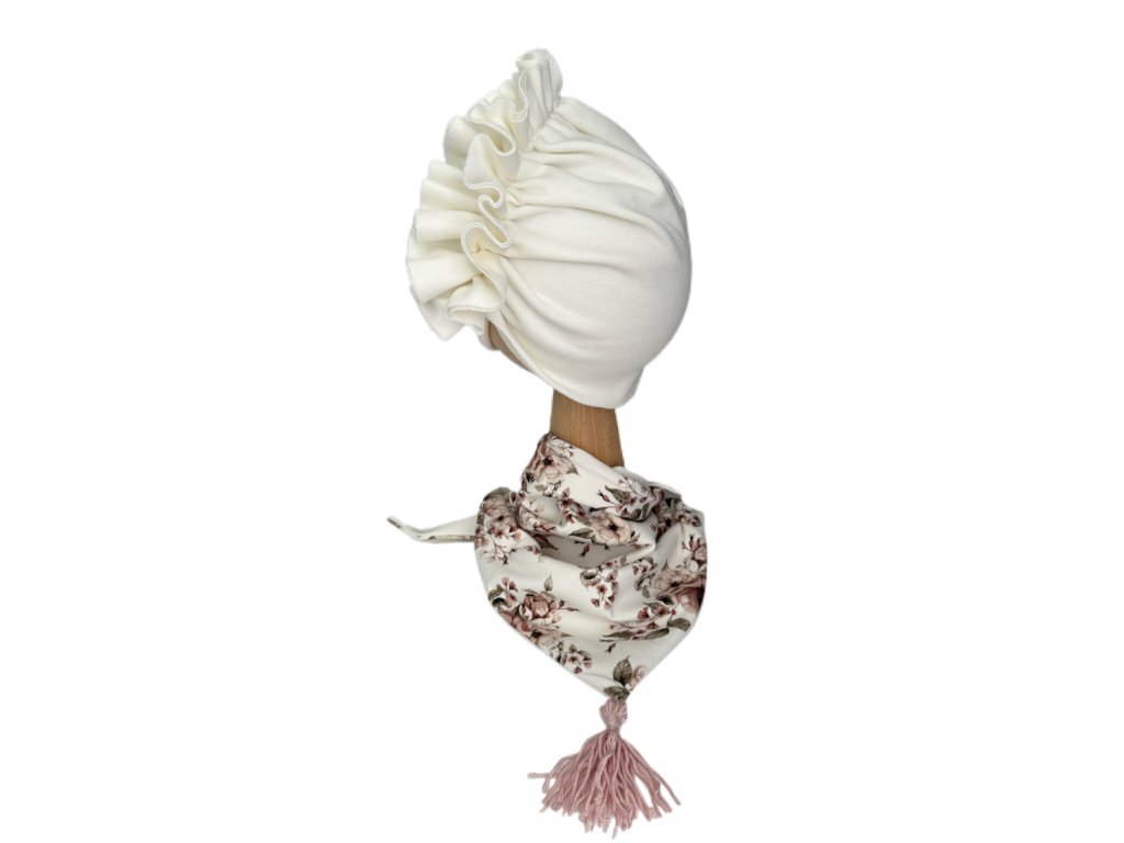 Turban je dvoj - vrstvový, ecru - jemná krémová farba. Šatka je trojuholníkového tvaru, dvoj - vrstvová - vrchná strana kvetová potlač v ružovej, spodná strana hladká ecru farba - ideálne pre skvelé kombinovanie. Spodok šatky doplnený milým brmbolčekom.