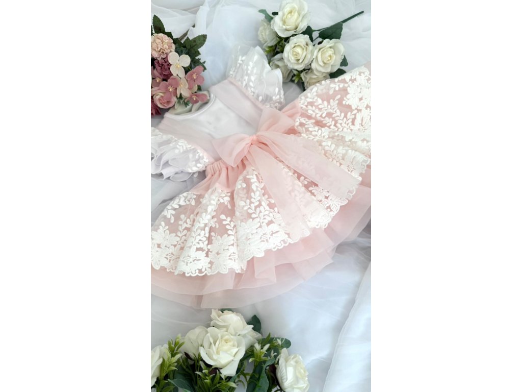 Základ sukničky je bohaté riasenie, v páse je gumička ktorá sa pekne prispôsobí obvodu. Traky sú zošité so sukničkou, dozdobené volánikmi tak, aby spolu so sukničkou vytvárali neodolateľný kúsok. Prednú časť dozdobuje v páse mašlička. Farba zodpovedá jemnej ružovo broskyňovej. Suknička sa predáva samostatne, v ponuke nájdete aj body aj čelenku, ktorú je možné prikúpiť.